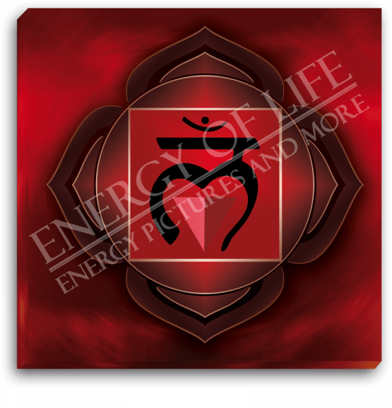 Zugeordnet ist Muladhara (die Wurzelstütze) der 4-blättrige Lotus. Seine Drehgeschwindigkeit und Frequenz korrespondiert im Lichtspektrum mit Rottönen. Im Zentrum des Bildes steht das uralte Sanskrit-Zeichen des Chakras.